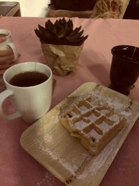 Vor dem Kaffee- und Kuchentisch hat sich eine Schlange gebildet. Wir können noch eine Waffel ergattern und lernen Mia und Anna kennen. Die beiden Studis der HU haben das Café auf die Beine gestellt und wollen uns gerne von ihrer Idee erzählen. Gerade sind sie aber noch mit Waffelbacken beschäftigt und wir verabreden uns für später. Bis dahin setzen wir uns zu den anderen Gästen und trinken in Ruhe unseren Tee.